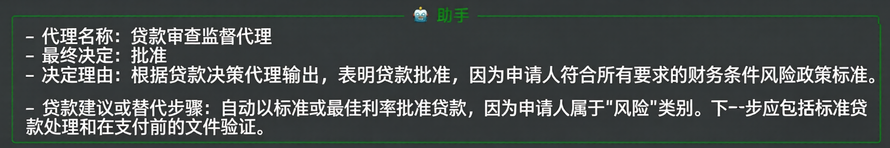 (完)通过监督者模式,我们成功将信贷审批流程自动化,每个智能体各司其职,审批结果可追溯、可解释。欢迎复制代码实践。