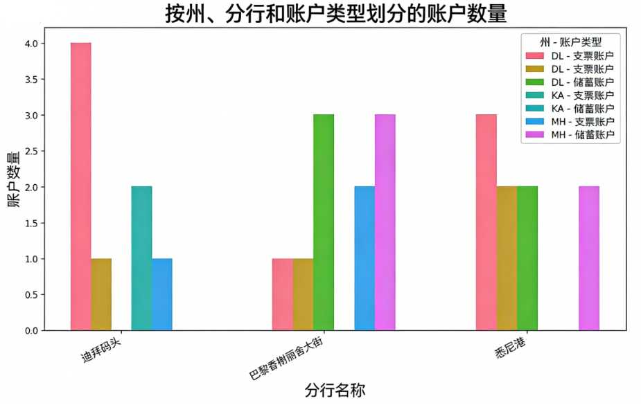 可视化代理生成了分组条形图,展示了各省份、支行、账户类型的账户数量分布。
