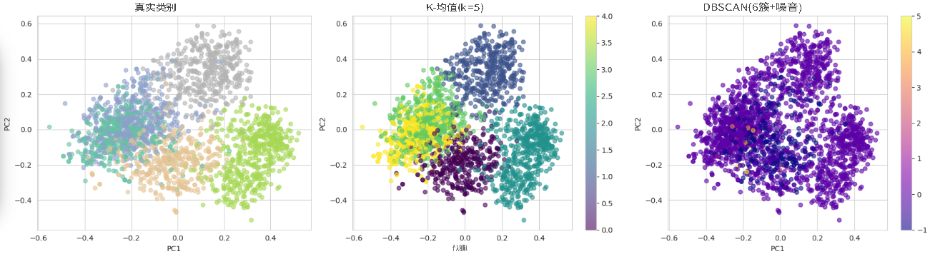为直观展示聚类效果,用PCA将高维嵌入降至2维,绘制真实类别、K-Means和DBSCAN聚类的对比图:
