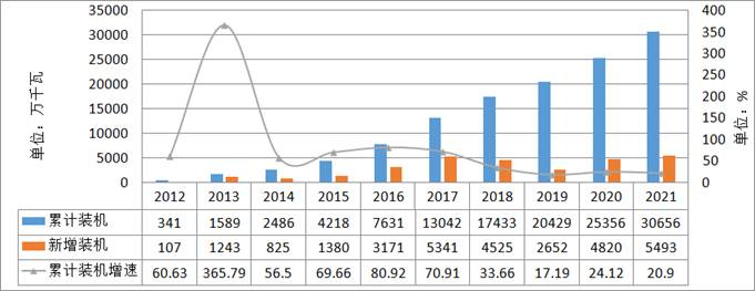 图1.1 中国2012-2021年太阳能发电装机及增速