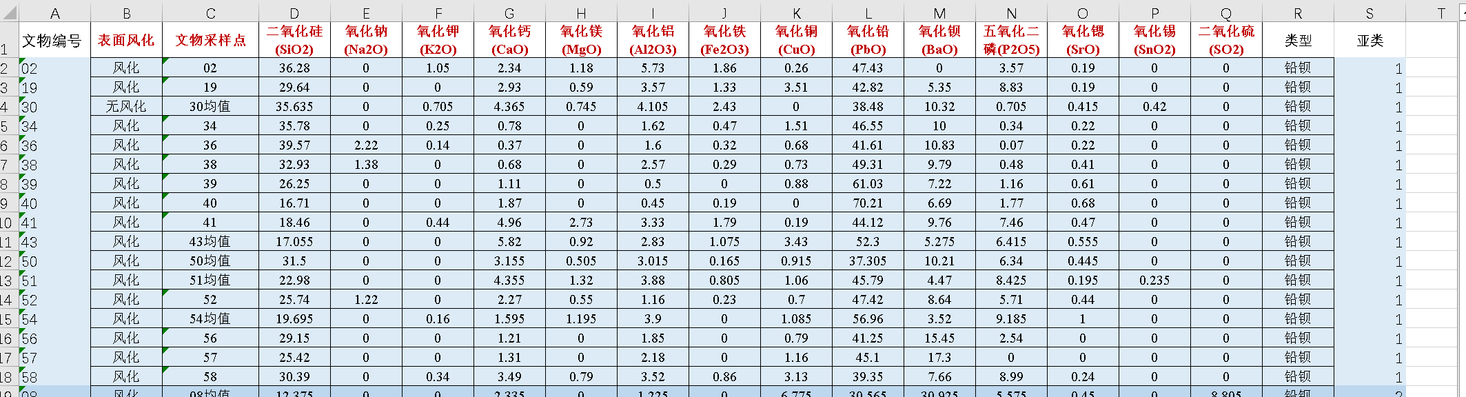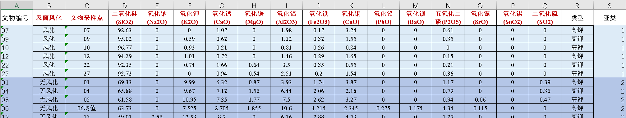 - 表单1:包含玻璃的类型(高钾玻璃、铅钡玻璃)、纹饰、颜色、表面风化状态;