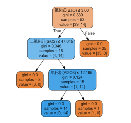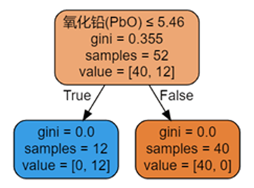核心结论:氧化铅(PbO)是最关键的分类指标——当PbO含量<5.46时,判定为高钾玻璃;当PbO含量≥5.46时,判定为铅钡玻璃,模型训练集与测试集准确率均为100%。