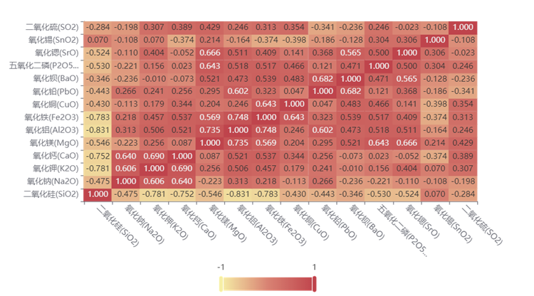 下图为铅钡玻璃成分相关性热力图,可观察到MgO与Al₂O₃(0.67)、PbO与BaO(0.65)呈强正相关:
