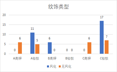 下图为“类型+纹饰”组合与风化的关联柱形图,可明确:(高钾,纹饰A)、(高钾,纹饰C)均未风化,(高钾,纹饰B)均风化,(铅钡,纹饰A/C)大部分风化。