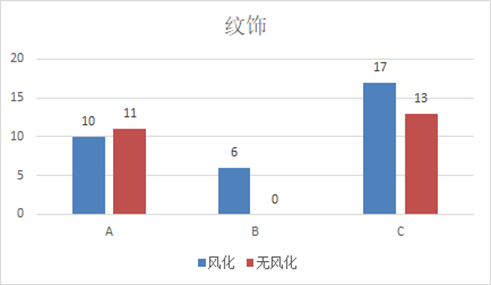 下图为纹饰与风化的关联柱形图,整体无明显规律,但可观察到纹饰B的玻璃均风化。
