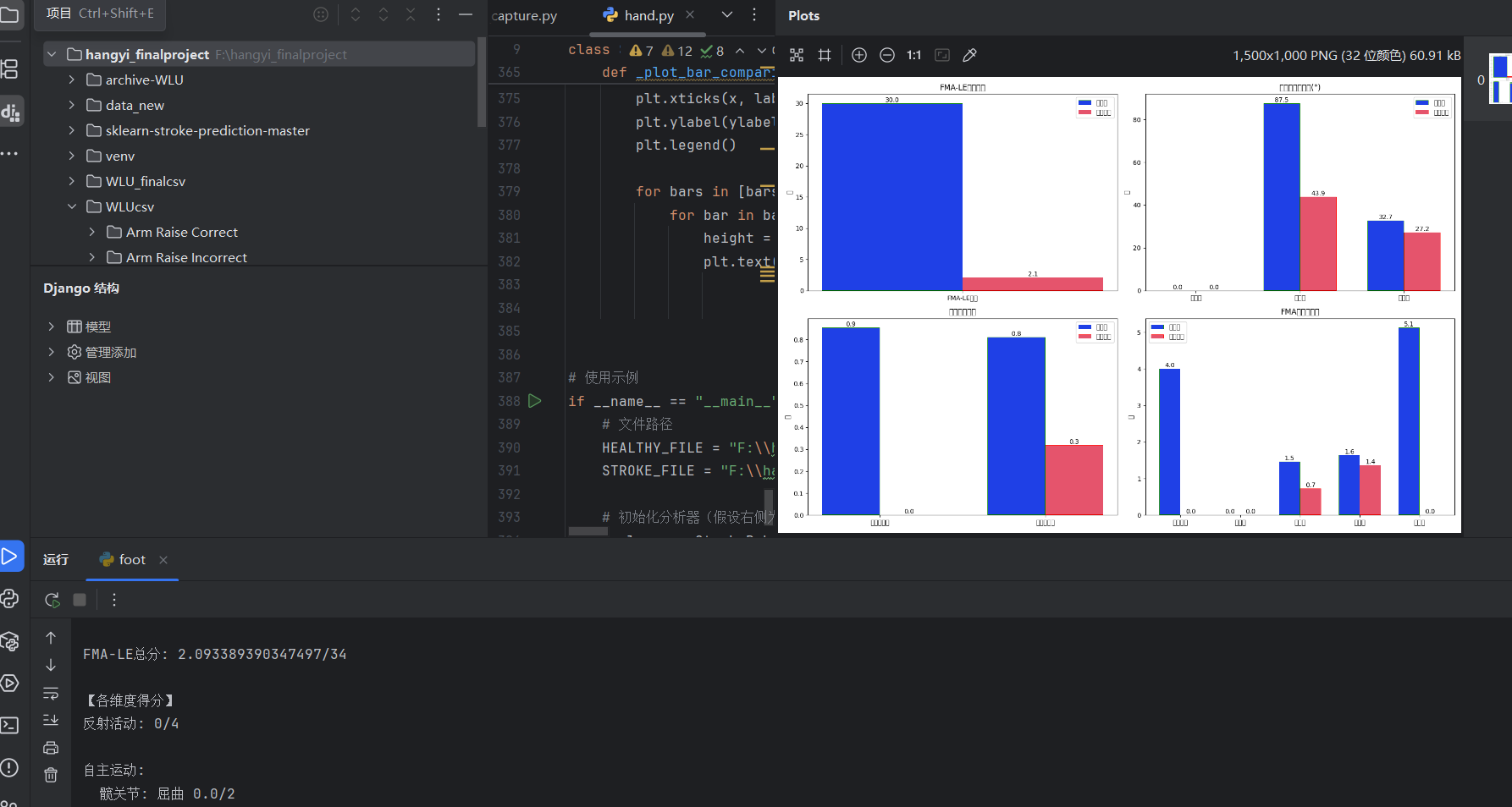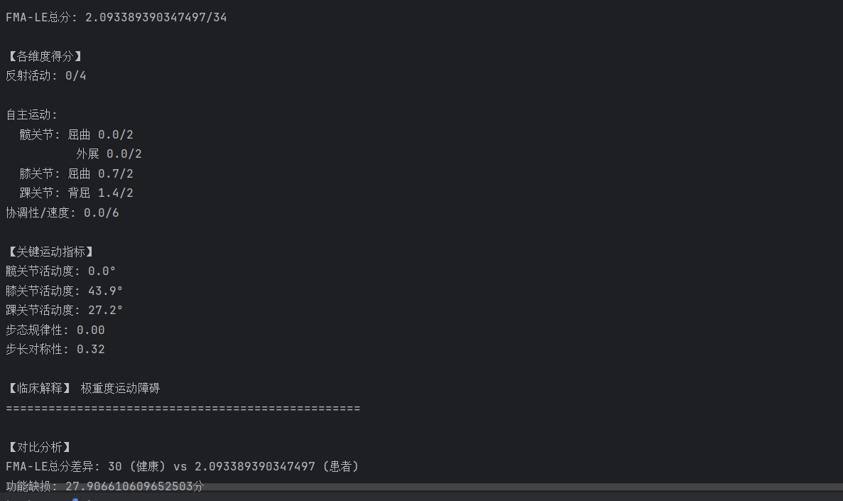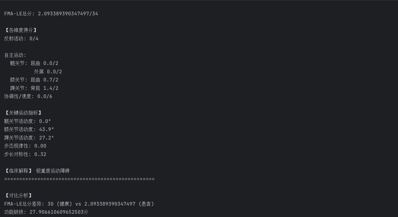 以下为下肢评估的报告输出与可视化对比结果。从结果可见:中风患者的FMA-LE总分(12分)显著低于健康人(32分),膝关节活动度(45°)仅为健康人的50%,步态规律性(0.35)也更差,符合临床中中风患者下肢运动功能受限的特征。