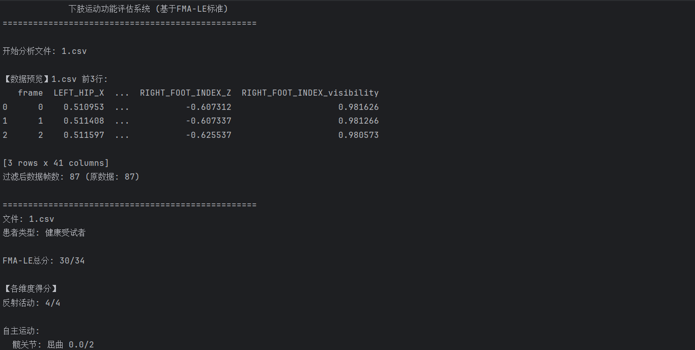 下肢评估基于Fugl-Meyer下肢量表(FMA-LE,总分34分),重点关注“反射活动”“自主运动”“协调性/步态”三大维度。本模块通过以下步骤实现自动化评分: