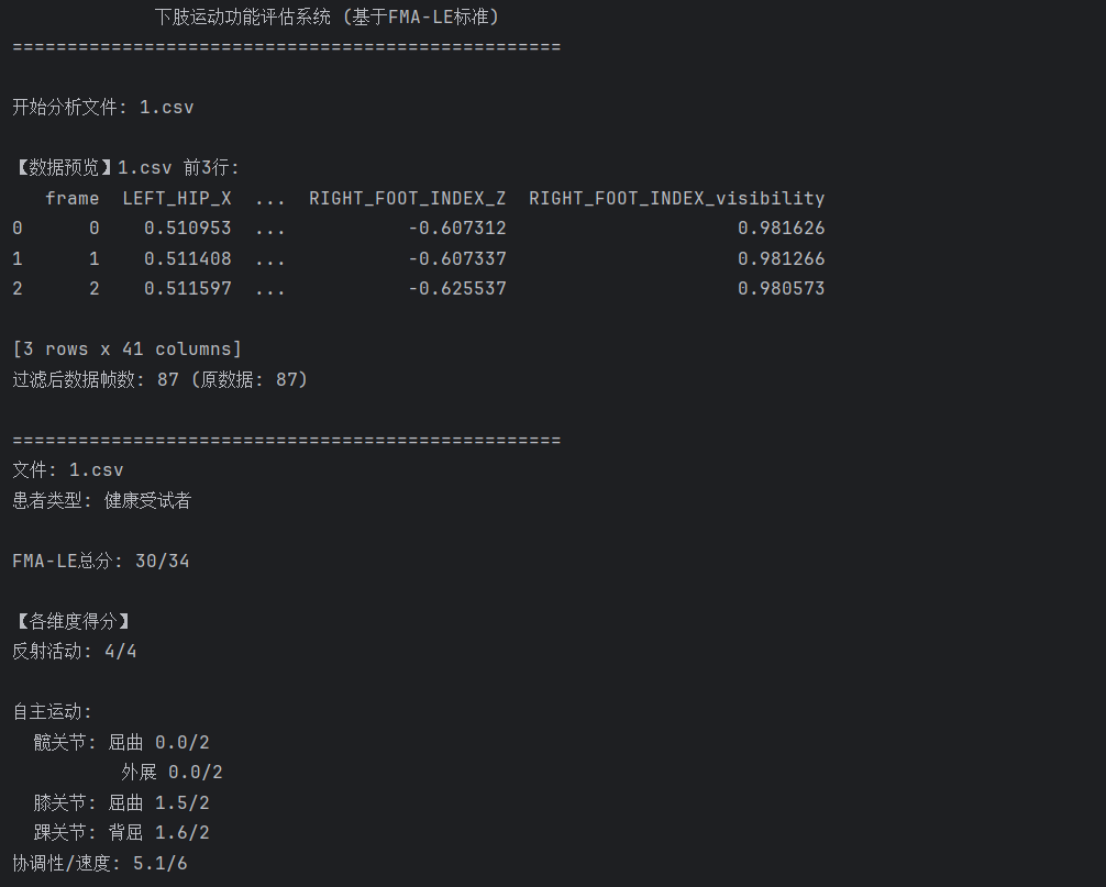 - 评分映射:将计算出的参数与FMA量表标准对比,输出各维度得分与总分,并判断运动障碍等级(轻度/中度/重度/极重度)。