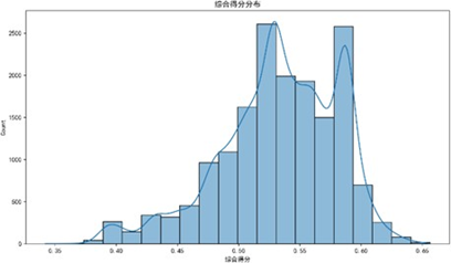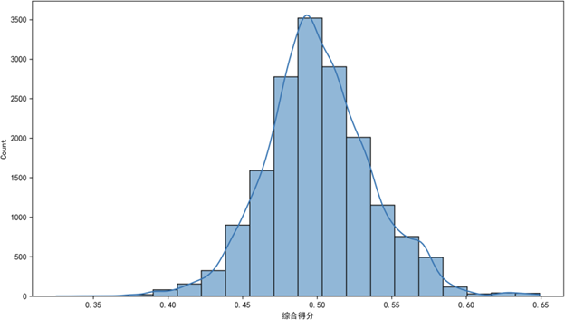 设定保留80%累积方差,通过PCA将23个子因子压缩为8个主成分,有效降低数据维度并保留核心信息;再用熵权法计算各主成分权重,最终得到质量可靠性综合得分。得分范围为0.325-0.649,呈单峰近似正态分布,峰值位于0.50附近,低分段(<0.40)与高分段(>0.60)样本占比均<5%,无极端异常值,数据离散性适中,说明构建的评价体系能有效刻画用户质量感知的集中趋势与个体差异。