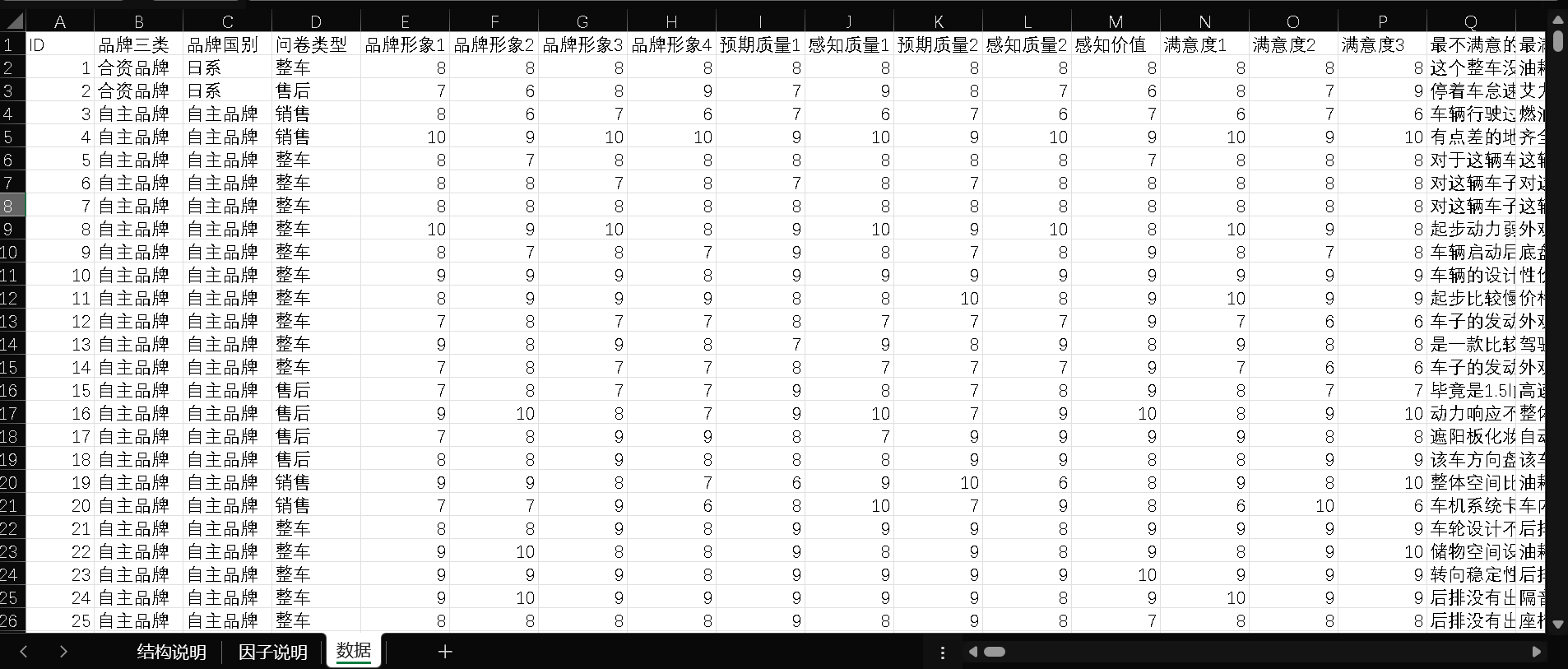 数据集涵盖满意度、品牌形象、感知质量(含质量可靠性、性能设计、销售服务质量、售后服务质量)等核心指标,我们采用"降维—赋权"两步法构建各维度综合得分:先通过因子分析(PCA)降维,剔除冗余信息,再用熵权法基于数据变异程度客观赋权,计算综合得分,确保评价体系的科学性与客观性。