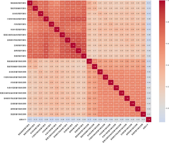特征变量相关性分析显示,核心质量可靠性指标(如发动机、行驶转向制动、智能座舱)呈中高度正相关(相关系数最高达0.75),验证了整车质量感知的系统协同效应;质量可靠性预期指标间存在中度正相关,体现用户质量预期的"跨系统传导效应";"故障水平"与质量指标呈负相关,验证了指标设计合理性,为后续故障影响分析提供支撑。