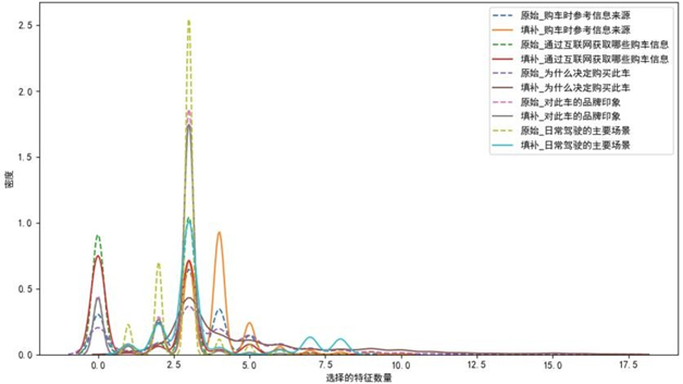 由于三类问卷样本量不均衡(整车16907份、销售3295份、售后4059份),直接建模会导致特征覆盖不全,我们采用MICE(多组链式方程插补)法处理缺失数据。该方法通过建立变量间的条件概率模型,迭代预测并填充缺失值,能更好地保留数据的变异性和变量间的相关性,优于传统均值填充等方法。