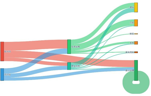 二分法分组与品牌属性的交叉分布通过桑基图可视化: