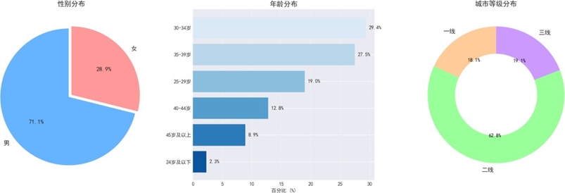 男性用户占比71.1%,女性占28.9%,与行业购车用户性别分布基本吻合,且近60%男性购车会参考配偶意见,车企需重视女性决策影响力。年龄结构上,30-34岁群体占比最高(29.4%),30-39岁群体合计占比56.9%,成为消费主力。城市等级分布中,二线城市占62.8%,一线城市占18.1%,三线城市占19.1%,样本分布契合不同城市用户的购车需求特征,为后续分场景分析提供支撑。