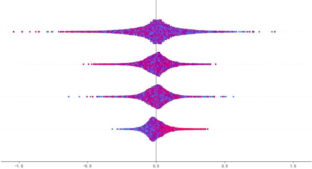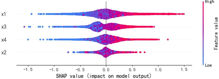 蜂群图显示,质量可靠性(x1)与感知质量呈强正相关,高值(红色)集中对应正SHAP值(显著推升预测),低值(蓝色)集中对应负SHAP值(显著抑制预测);销售服务(x3)、售后服务(x4)呈弱正相关,影响幅度弱于质量可靠性;性能设计(x2)为弱影响特征,SHAP值持续围绕0波动,对预测的边际贡献差异极小。