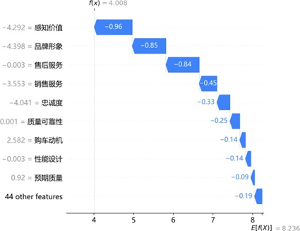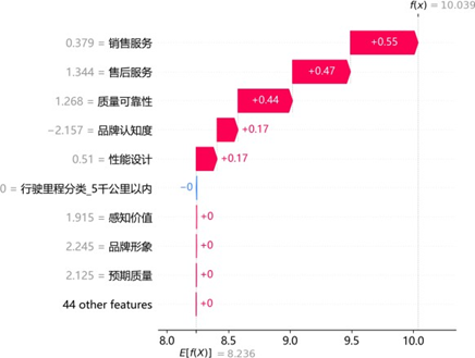 高满意度样本中,销售服务(0.55)、售后服务(0.47)、质量可靠性(0.44)及品牌认知度(0.17)为核心正向驱动,共同推升预测值显著高于均值;低满意度样本中,感知价值(-0.96)、品牌形象(-0.85)、售后服务(-0.84)及销售服务(-0.45)为关键负向拖累,即使质量可靠性等存在微弱正向贡献,仍无法抵消整体抑制效应。同一特征(如售后服务)在不同样本中呈现双向差异贡献,印证其影响的非线性与情境依赖性,为精准化服务策略制定提供了微观层面的依据。