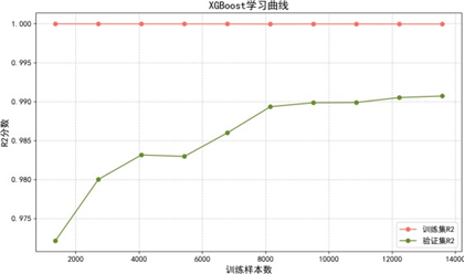 当学习率为0.1、最大深度为6、迭代次数为300时,模型达到最优性能,R²提升至0.9935,进一步提升了预测精度。
