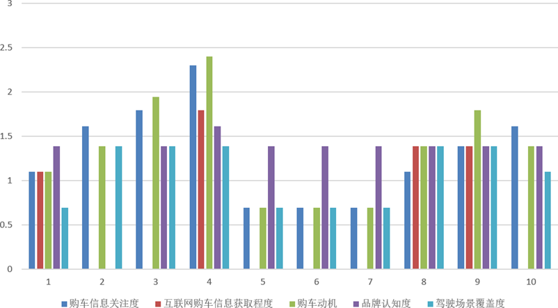 随后对多选题合计得分进行自然对数变换,合成"购车信息关注度"“互联网购车信息获取程度”“购车动机”“品牌认知度”"驾驶场景覆盖度"5个新指标,这些指标能有效反映用户在购车决策各环节的行为特征,为后续消费者分群与满意度影响因素分析提供了丰富的特征支撑。