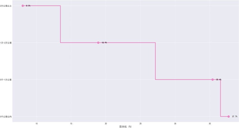 汽车行驶里程分布中,5千公里以内和5-1万公里的短期里程占比73.1%,对应3-12个月新用户;1-2万公里和2万公里以上的中长期里程覆盖1-3年用户,该分布契合行业新车使用规律,可全面捕捉用户全生命周期体验变化。