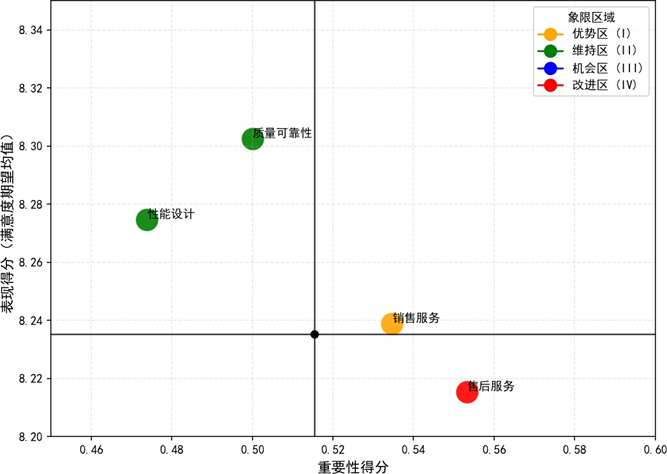 为精准定位优化优先级,我们引入重要性—表现分析(IPA)模型,通过计算质量可靠性、性能设计、销售服务、售后服务四大核心维度的重要性与表现得分,构建二维决策矩阵,划分优势区、维持区、机会区、改进区四个象限。