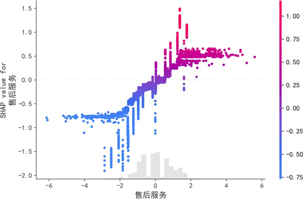 售后服务的SHAP依赖图表明,其对满意度的影响呈非线性:评分<2时SHAP值多为负,抑制满意度;评分>2后,SHAP值随评分上升呈非线性增长,且增长速率逐渐加快,凸显售后服务质量突破临界值后的显著正向效应。
