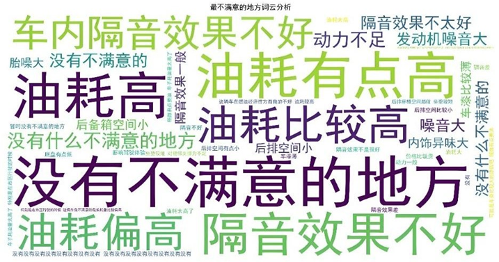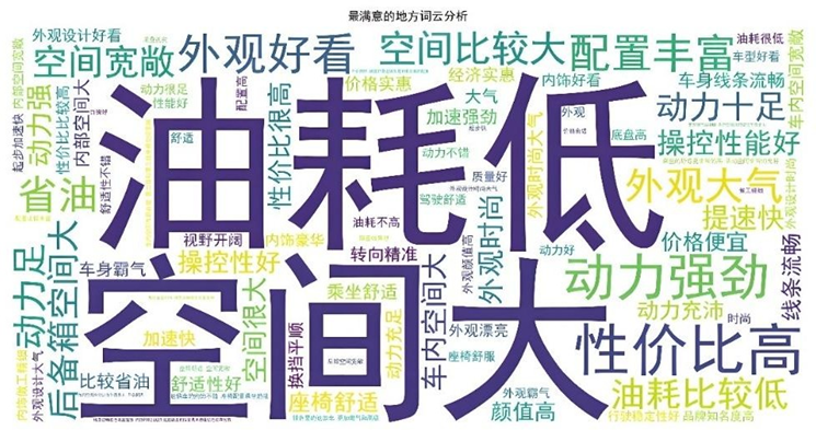 “最不满意"文本中"油耗”"隔音"高频出现,反映用户核心痛点;“最满意"文本中"空间”“油耗”"外观"占比领先,体现产品核心优势。同时,"最不满意"文本中出现"没有不满意"表述,需通过规则校准避免误判。