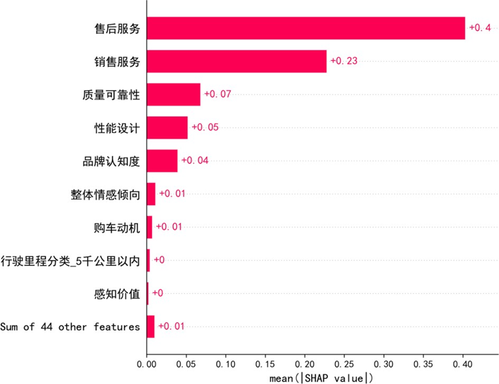 SHAP特征重要性显示,售后服务(0.40)、销售服务(0.23)对满意度的解释力最强,是核心驱动因素;质量可靠性(0.07)、性能设计(0.05)、品牌认知度(0.04)等呈显著正向影响,其余44项特征总贡献仅0.01,边际效应可忽略。