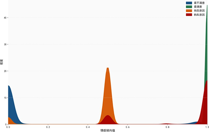 “最不满意的地方"情感值趋近0(消极),含"无"的"抱怨原因”“购车最主要原因"文本情感值为0.5(中性),“最满意的地方"情感值趋近1(积极),分布界限清晰,验证了模型分类的有效性。