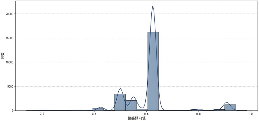 整体情感倾向值在0.6附近形成显著峰值,超半数样本属于"中性偏正面"评价(整体认可但存局部不满),构成品牌体验的"基础共识区间”;[0.4,0.5]区间存在次高峰,10%-20%样本持"中性偏负面"情感,隐含体验缺口与流失风险,可定义为"沉默的流失隐患群体”;极端正面评价([0.8,1.0]区间)占比极低,但作为品牌口碑核心传播源具有战略价值,整体分布呈现显著多样性,反映用户体验的多维复杂性。