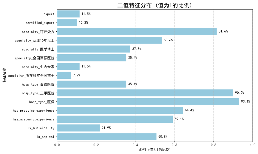 - 标签特征工程:对specialty_tags(专业标签)进行频率分析,提取高频标签作为独热编码特征;从hospital_info_tag中提取出hosp_type_百强医院、hosp_type_三甲医院等关键二值特征。