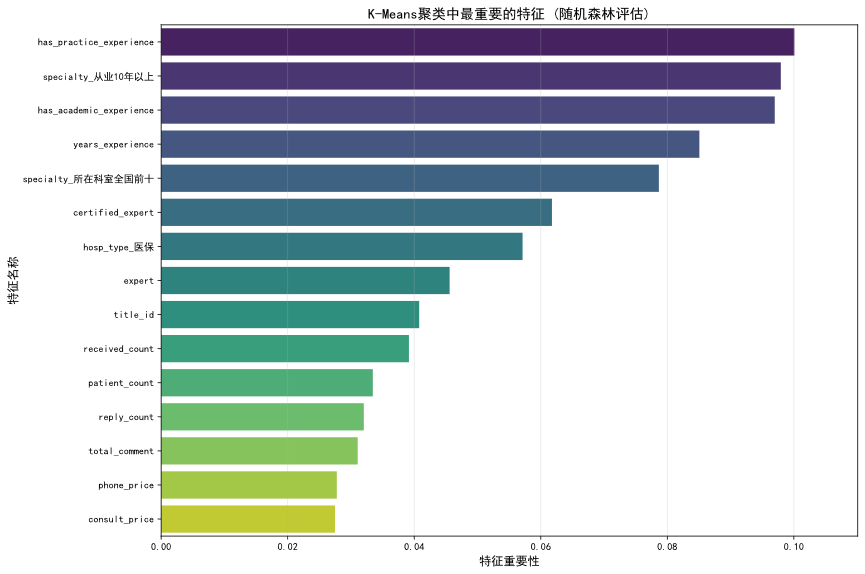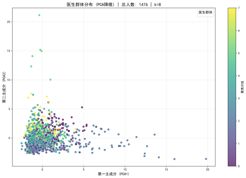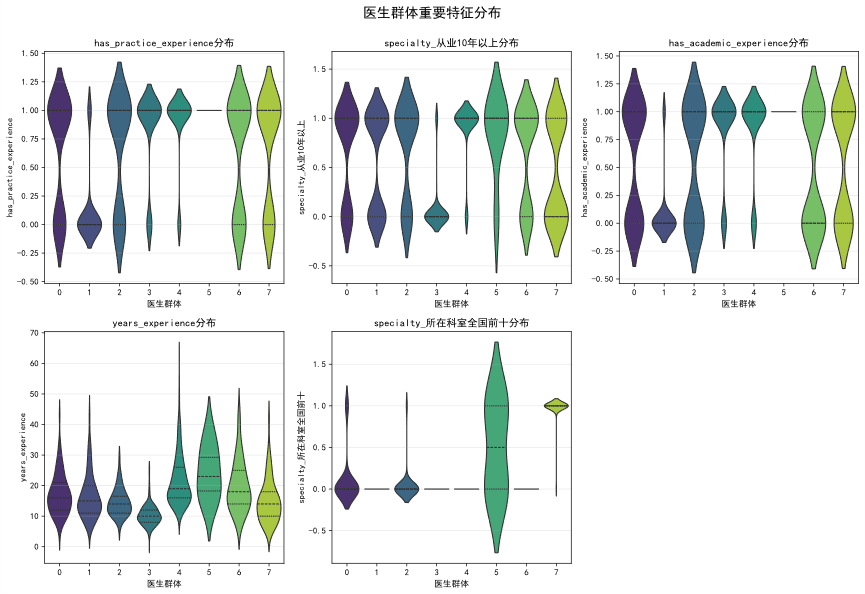 - 医生群体结构分析与画像构建: 运用非监督学习算法(K-Means聚类)对医生群体进行数据驱动的分层,识别并描绘具有不同特征的医生群体画像,从而深入理解平台医生生态的构成与多样性。