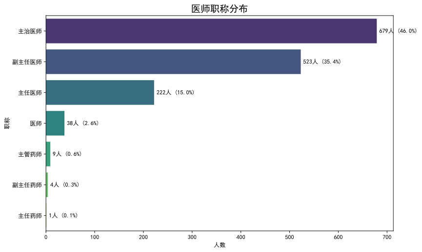 探索性数据分析(EDA) 通过对核心字段的描述性统计分析,我们勾勒出丁香医生平台医生的整体画像,其主要特征如下:平台医生以主治医师 (46.0%) 和副主任医师 (35.4%) 为绝对主力,二者合计占比超过80%,表明平台医生群体具备扎实的专业水准和临床经验;90.0% 的医生来自三甲医院,93.1% 的医生所在医院为医保定点机构,反映平台在医生准入上具有较高门槛,核心医生资源高度集中于国内优质医疗机构;超过半数(53.6%)的医生从业年限超过10年,近四成(37.5%)拥有医学博士学位,超过八成(81.6%)具备在线处方权,这些数据共同印证平台医生群体的资深性与专业性。