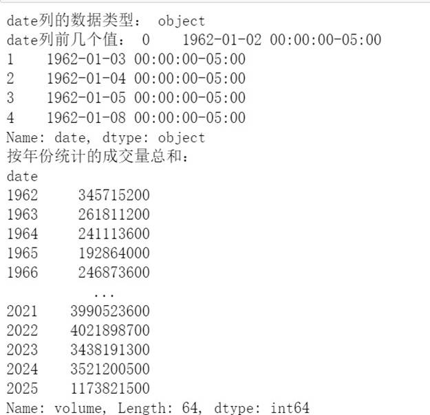分析目标:统计1962年到2025年按年份的成交量总和,观察长期成交量变化趋势。