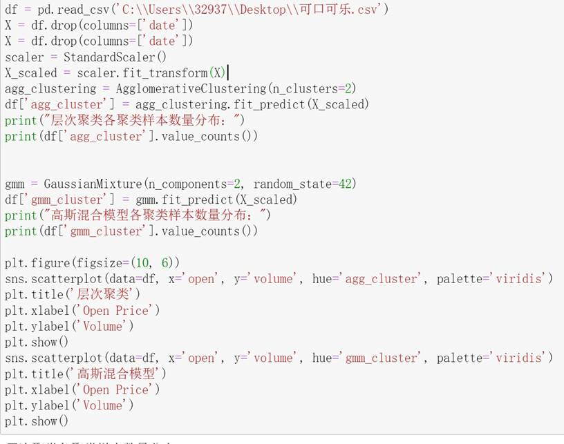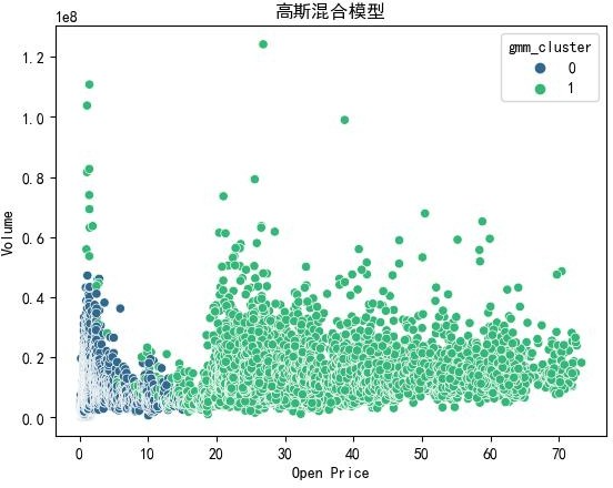 绿色点(gmm_cluster为1)占据大部分区域,蓝色点(gmm_cluster为0)仅在低开盘价区域少量分布,两类样本数量差异较大。蓝色聚类集中在低开盘价、低成交量区域且分布集中;绿色聚类覆盖宽开盘价范围,成交量在不同水平都有分布。该模型强调一种主要交易特征模式(绿色聚类),与层次聚类对数据结构的理解不同,提示需结合多种模型结论综合分析,更全面把握股票交易规律。