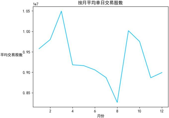 分析结论:除3月、9月的高峰和8月的低谷外,其他月份的平均交易股数呈现一定波动。1月至2月呈上升趋势,3月后逐渐下降,4月至6月持续走低,7月进一步下降,8月触底后9月大幅回升,随后再次波动变化。这表明市场活跃度受多种因素影响呈现周期性波动。
