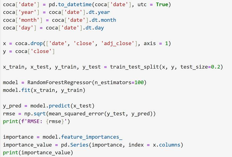 建模目标:用随机森林模型量化各特征对可口可乐股票收盘价的影响程度,明确不同特征在预测收盘价过程中的作用大小,为投资者和分析师提供精准决策依据。