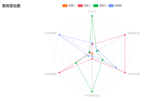 我们将889个渠道聚类为4类,通过雷达图直观呈现各类渠道特征:第一类(39%):各指标表现差,投放需谨慎取舍,避免资源浪费;第二类(35%):转化效果好但流量不足,适合精准转化,可适当加大投放力度提升流量;第三类(8%):流量大,适合品牌宣传,用于提升品牌知名度与用户覆盖;第四类(17%):引流与转化双优,需重点关注,倾斜更多预算资源。