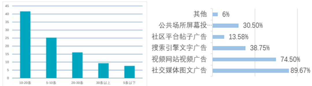 学生群体(40%)面临考试备考、技能提升的需求,上班族(42%)因技术迭代需要持续学习,两者共同构成在线教育的核心消费群体。针对这两类人群的广告内容应突出“备考提分”“职场晋升”等核心卖点。用户每天接触10条以上在线广告的比例接近70%,其中10-20条的占比最高(41.67%),说明用户日常被广告高频触达,广告竞争激烈。