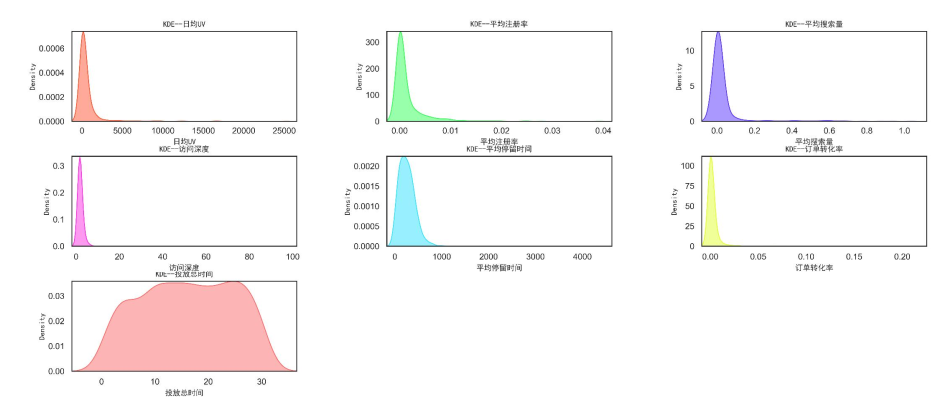OSM模型将业务目标(O)、策略(S)、指标(M)层层拆解,确保每个指标都与核心目标强相关,避免“指标泛滥”导致的分析偏差。通过KDE核密度分析发现,广告投放总时间分布均匀,而日均UV、订单转化率等指标呈极度偏态分布——75%的渠道日均UV低于466.87,最高却达25294.77,说明渠道流量差异极大,存在“少数超级渠道垄断流量”的现象。描述性统计显示,平均注册率与订单转化率均值极低(分别为0.0014、0.0029),说明在线教育广告的转化效率普遍不高,需通过渠道优化与内容升级提升转化效果。