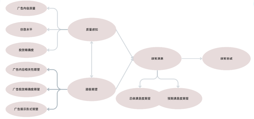 碎石图显示,前三个因子的特征值下降明显,第四个及以后因子特征值变化平缓,进一步验证了提取3个公共因子的合理性。基于ACSI模型构建SEM结构方程模型,验证了质量感知、顾客期望对顾客满意的正向影响(标准化回归系数分别为0.646、0.712),顾客满意对顾客忠诚的正向影响(标准化回归系数0.757),模型拟合效果良好(卡方自由度比1.595,GFI=1.685,RMR=0.045)。这一模型表明,用户的期望与实际感知质量共同决定满意度,而满意度直接影响推荐意愿与复购行为。企业不仅要提升广告质量,还要管理用户期望,避免过度宣传导致的心理落差。