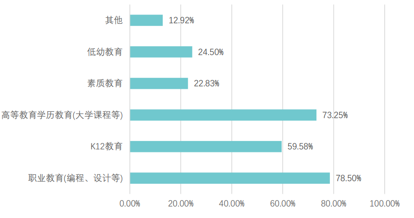 从接触渠道看,社交媒体(89.67%)与视频网站(74.50%)是用户接触在线教育广告的主要平台,这与当下用户的媒介使用习惯高度契合,广告投放应重点布局这两大渠道。在内容偏好上,78.5%的用户关注职业教育,73.25%关注高等教育学历教育,成为在线教育广告的核心发力方向;K12教育关注占比59.58%,低幼教育与素质教育占比相对较低。