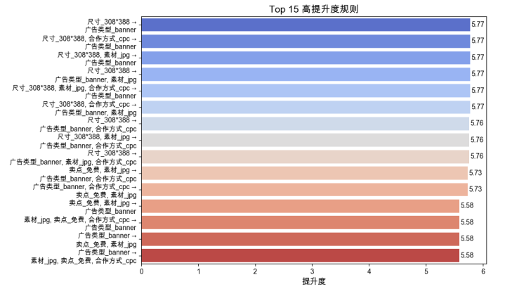 核心发现:banner广告+308*388尺寸(提升度>5.7)、免费卖点+jpg素材+CPC合作方式的组合效果最优;信息流广告搭配视频素材+600*90尺寸关联性强,这些组合可直接应用于广告制作与投放。