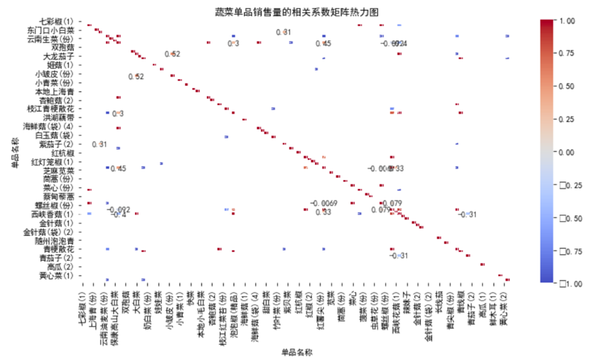 - 强正相关案例:“七彩椒 (1)”与“东门小白 (1)”相关系数接近0.5,两者可能都是凉拌菜常用食材,消费场景高度重合;