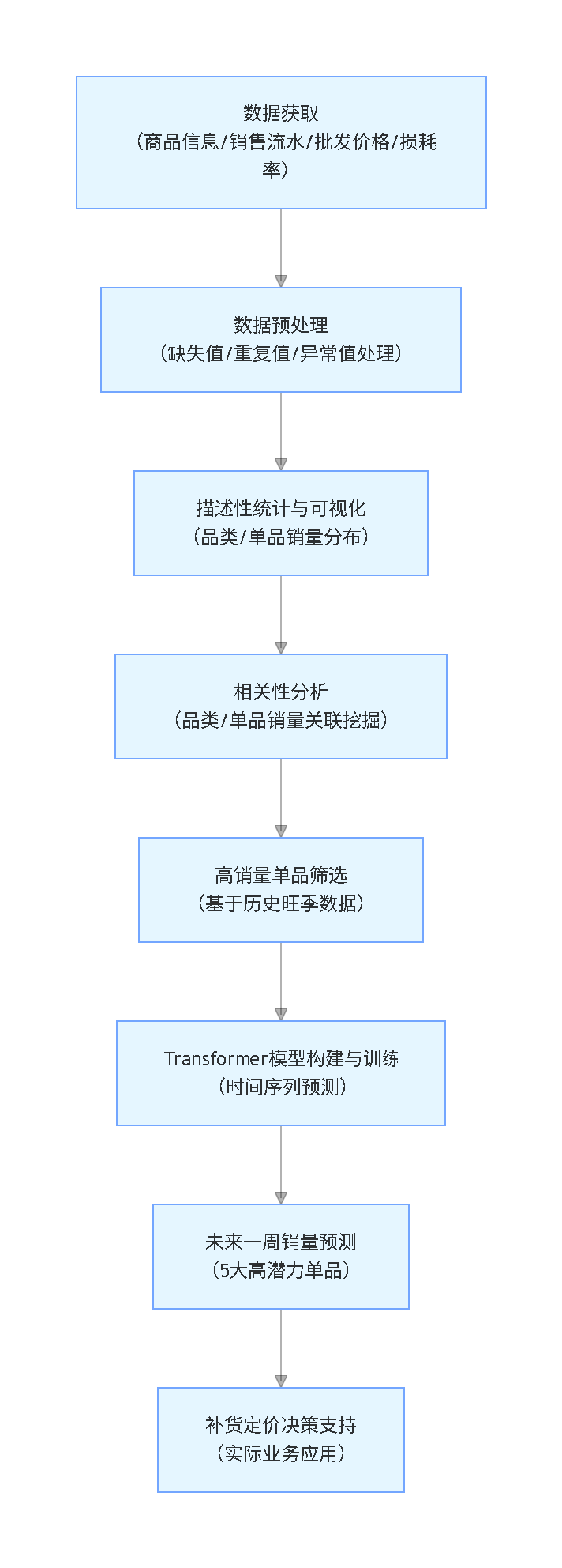本研究采用”业务导向-数据驱动-模型落地”的闭环思路:首先收集商品信息、销售流水等多维度数据,经过清洗预处理后,通过描述性统计与可视化呈现销量分布特征;再通过相关性分析挖掘品类与单品间的关联规律;接着基于历史旺季数据筛选高销量潜力单品;最后构建Transformer神经网络时间序列模型,实现核心单品未来一周销量预测,并通过实际业务场景验证模型有效性。