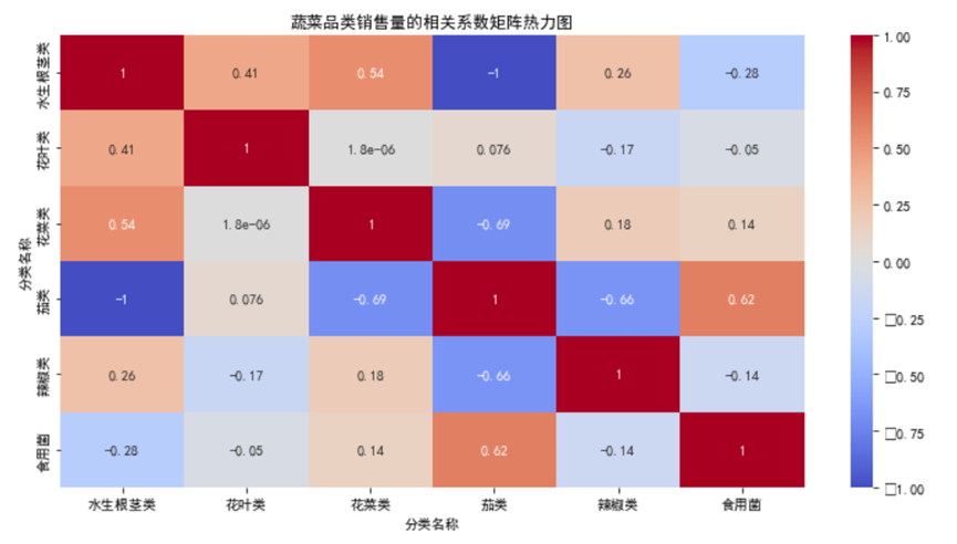 - 水生根茎类与花菜类相关系数达0.54,属于强正相关——这意味着当水生根茎类销量上升时,花菜类销量也大概率上升,可能因为两者常搭配烹饪(如清炒时蔬组合),商超可将这两类蔬菜就近陈列,促进连带销售;