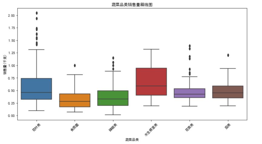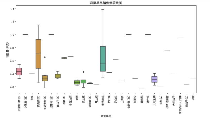 从图中能直观看到单品间的销量差异:部分单品(如云南生菜、西兰花)销量中位数高,且分布范围广,属于“爆款单品”;而有些单品销量中位数接近0,且波动极小,属于“长尾单品”。这种差异源于消费者偏好、烹饪场景等因素——爆款单品多为家常菜常用食材,消费频次高;长尾单品则可能针对特定消费群体,需求相对小众。