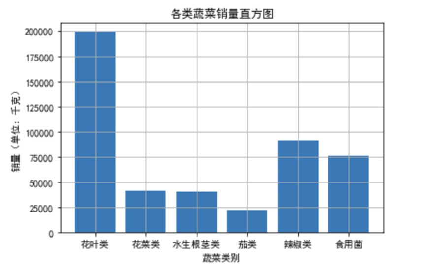 通过统计各蔬菜品类的总销量并可视化,我们清晰看到不同品类的销售特征: