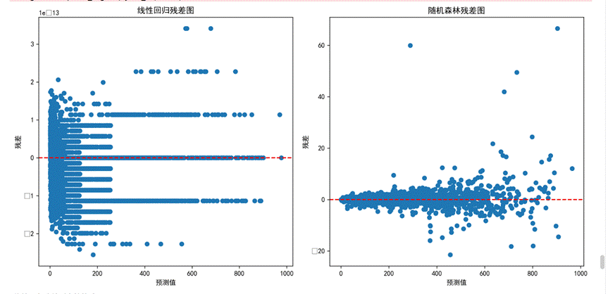 残差分析结果显示:线性回归的残差p值远小于0.05,不服从正态分布,说明线性模型无法捕捉数据中的非线性关系;随机森林的残差分布更接近正态,但仍存在少量异常值,需在后续模型中进一步优化。