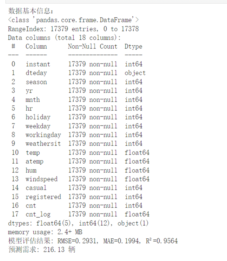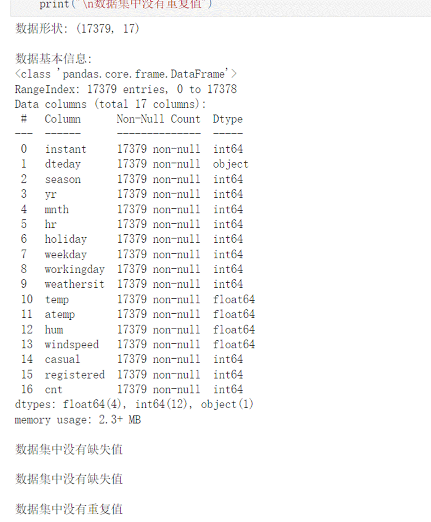 运行上述代码后,可得到数据集的基础信息:该数据集包含17379条记录、17个字段,涵盖时间特征(season、yr、mnth、hr等)、天气特征(weathersit、temp、hum等)、出行需求特征(casual、registered、cnt)等核心维度,且无缺失值与重复值,为后续分析奠定了良好基础。