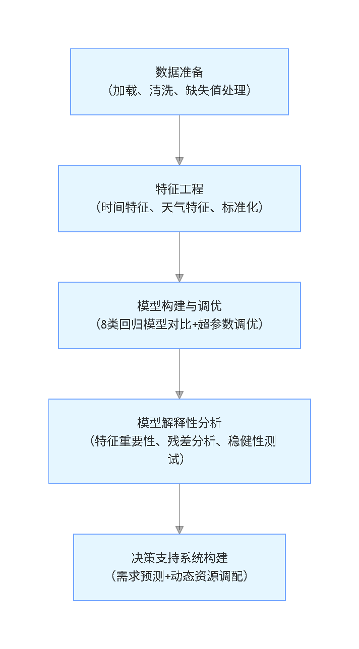 本文聚焦共享单车需求预测与资源优化这一实际业务痛点,从真实的共享单车运营数据集(hour.csv)出发,完整呈现了从数据准备、特征工程、多模型构建与调优,到模型解释性分析、决策支持系统落地的全流程解决方案。相较于传统的单一模型预测方式,本文创新地对比了线性回归(含Ridge、Lasso变种)、KNN回归、SVM回归、决策树回归(含随机森林、XGBoost)等8类回归模型的预测效果,并针对最优模型进行超参数调优与解释性分析,最终构建了可落地的动态资源调配决策支持系统,实现了需求预测精度与资源利用效率的双重提升。